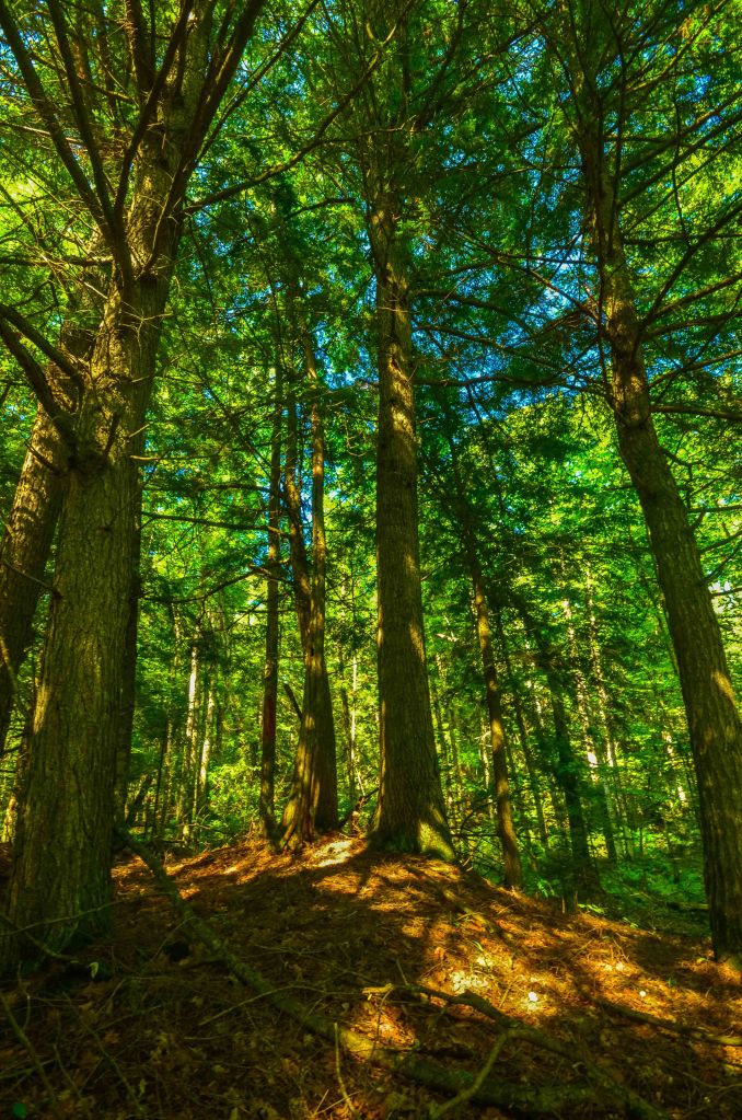 My exploration on this day focused on the northern parcel, as it is described as one of the parcels containing the best hemlocks as well as being easiest/most direct to access. Being late August at the time of the visit, however, the ephemeral ponds had indeed lived up to their ephemeral status and were largely gone from the landscape. The terrain was gorgeously rolling and sun-dappled on this steamy summer day, though the relative lack of light was, at times, inconvenient for hand-held photography. One would be wise to take care when moving about in this type of natural community as there are many ‘ankle-breakers’, tree roots, or soft areas that a foot may punch through.