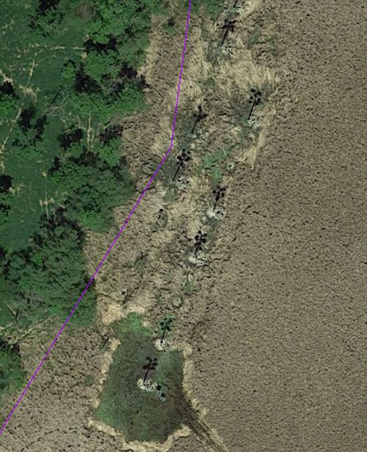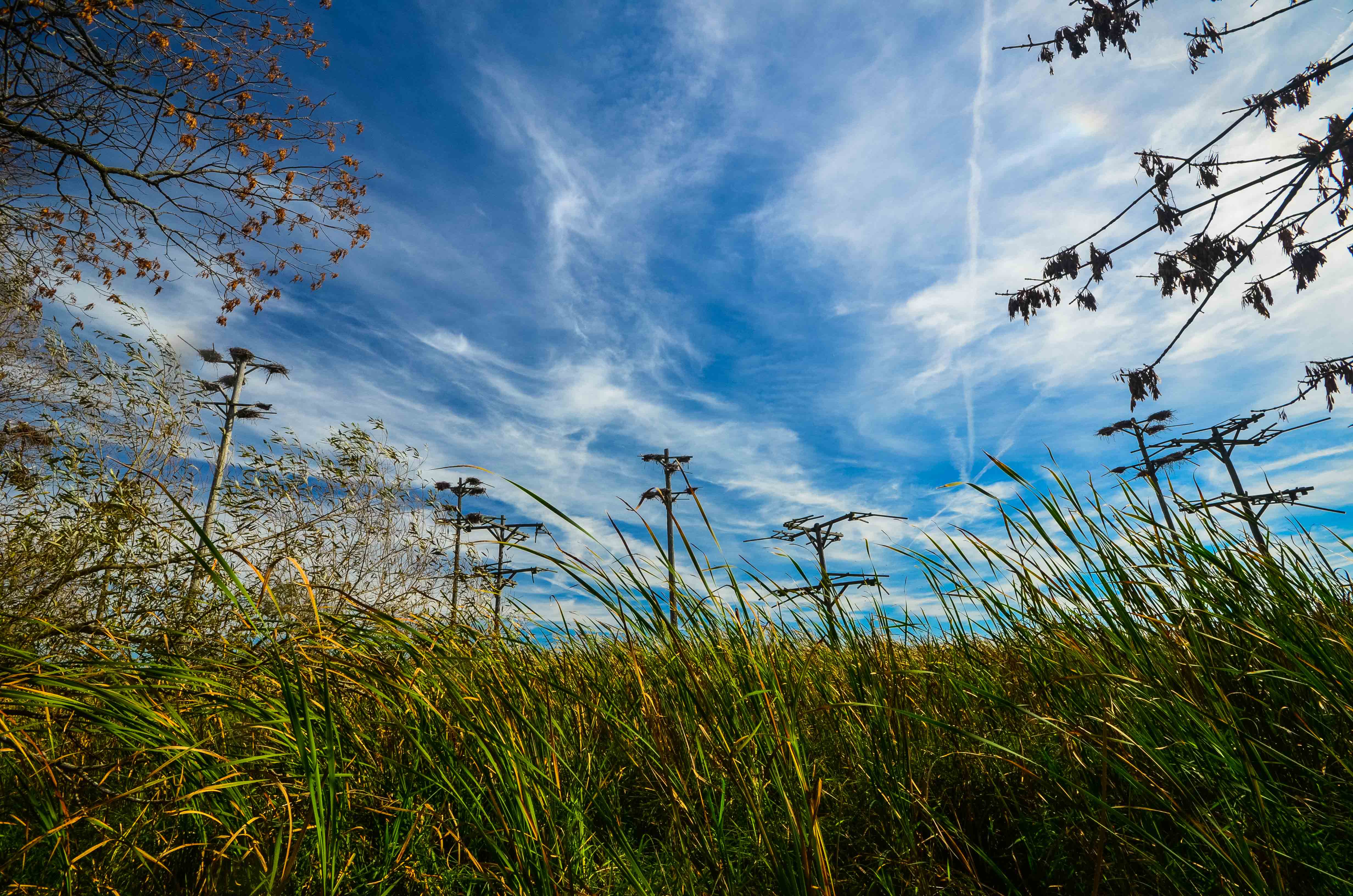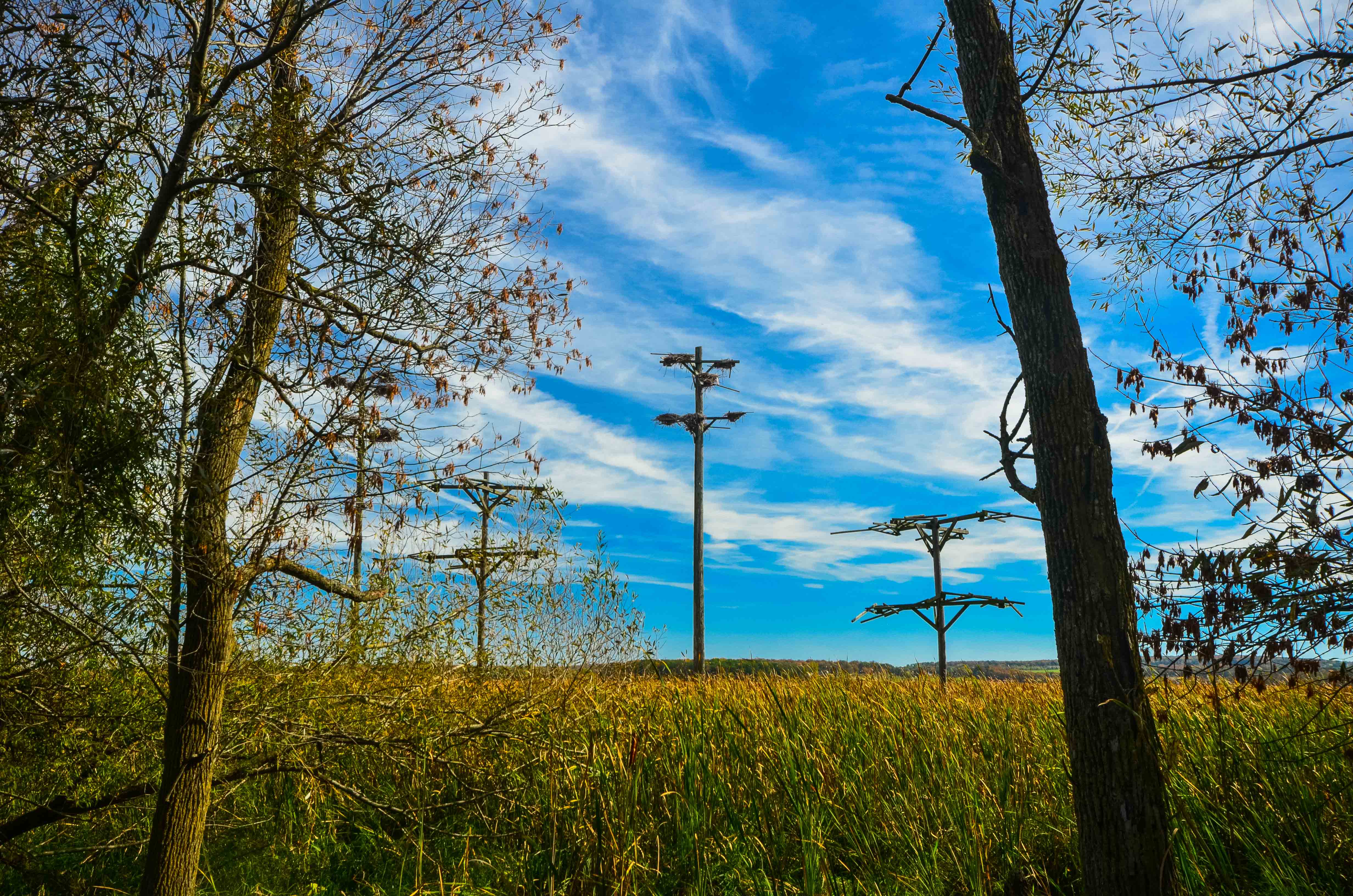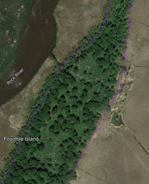 I recall the paddle being non-eventful, with nothing notable concerning the current, obstacles, or the like. We followed the canoe trail path, only in reverse. A closer examination of the island via satellite imagery revealed a potentially complicating factor: cattails rimming the island, which could make it rather difficult to reach terra firma. Zooming in to the satellite photos reveals what appeared to be small channel to get most of the way to the island and this point became our destination. In the left photo below, note the channel from the northwest. While reviewing the satellite imagery, I also got a good look at the artificial nesting platforms, just off the opposite side of the island (below, right). These modified telephone poles are meant to provide nesting options for birds in place of the damaged and diseased natural trees that have been increasing in number on the island.