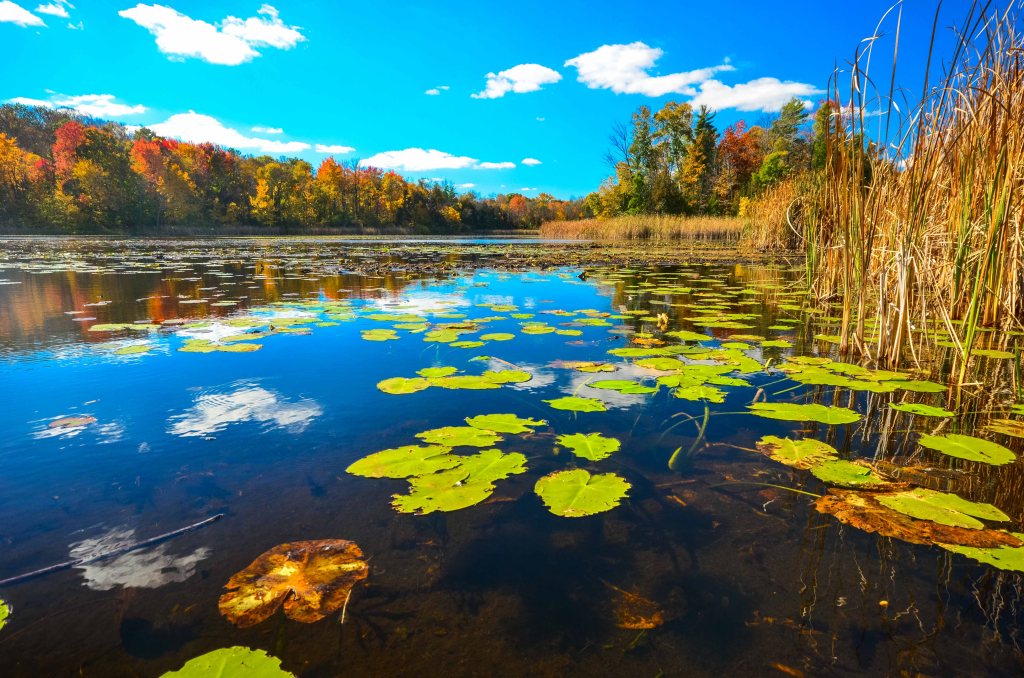 The trail emanates from a parking lot off of Cover Valley Rd, wanders through an old farm field (perhaps a prairie restoration possibility here?), before leading to a boardwalk to the lake. A side trail meanders off into the forest and dead-ends. I came here in hiking boots and regretted that choice as it limited the amount of wetland exploration I could do. The namesake lake was gorgeous on this fall day, with ample lily pads contrasting with the amber stalks of senescing vegetation.