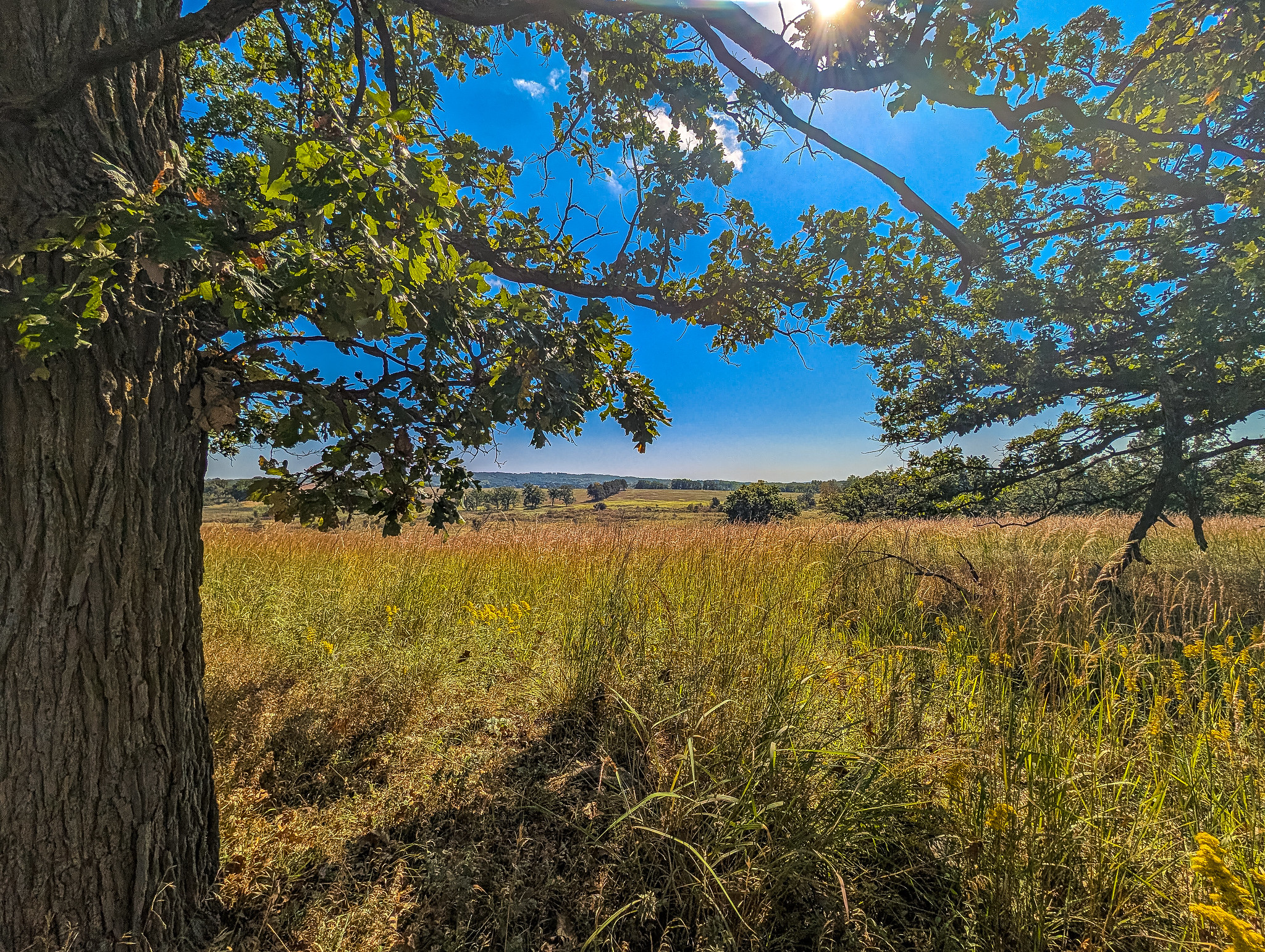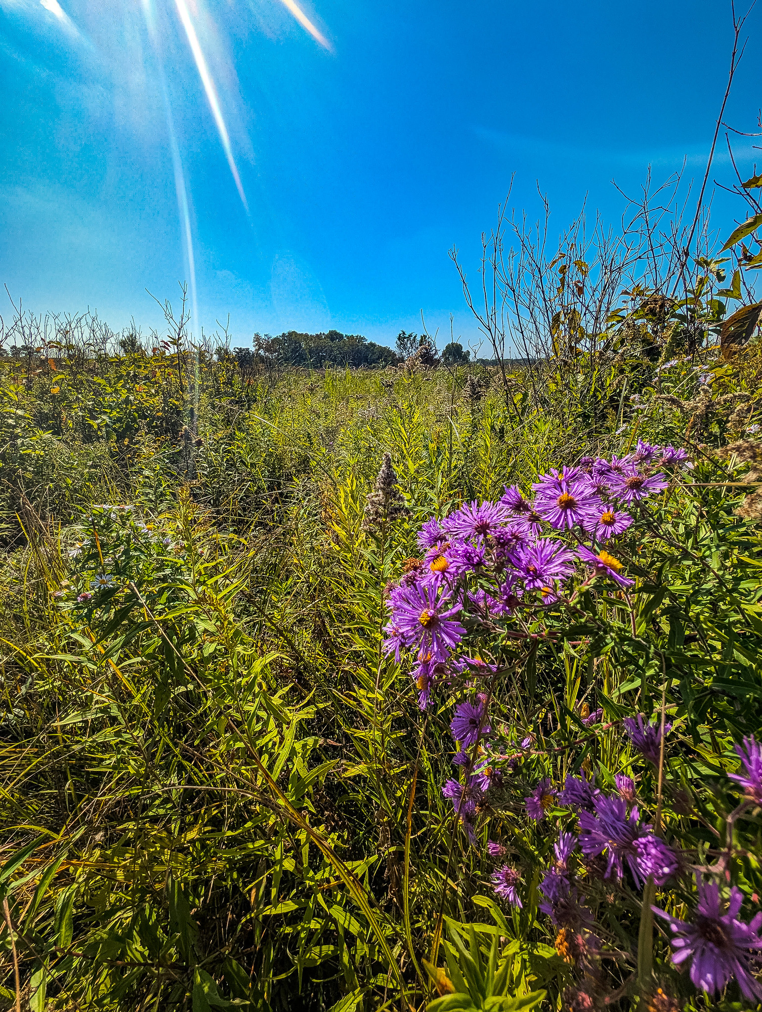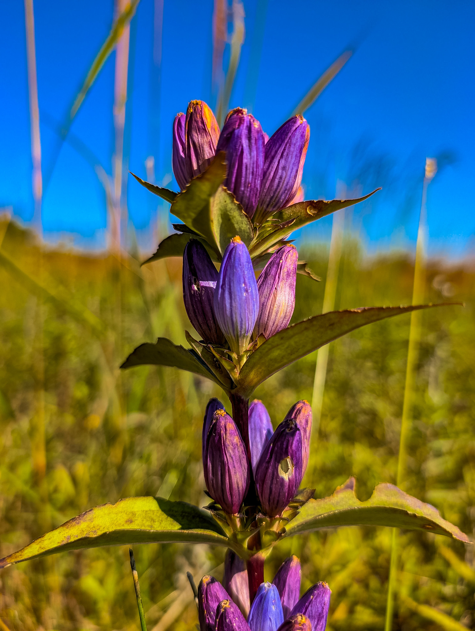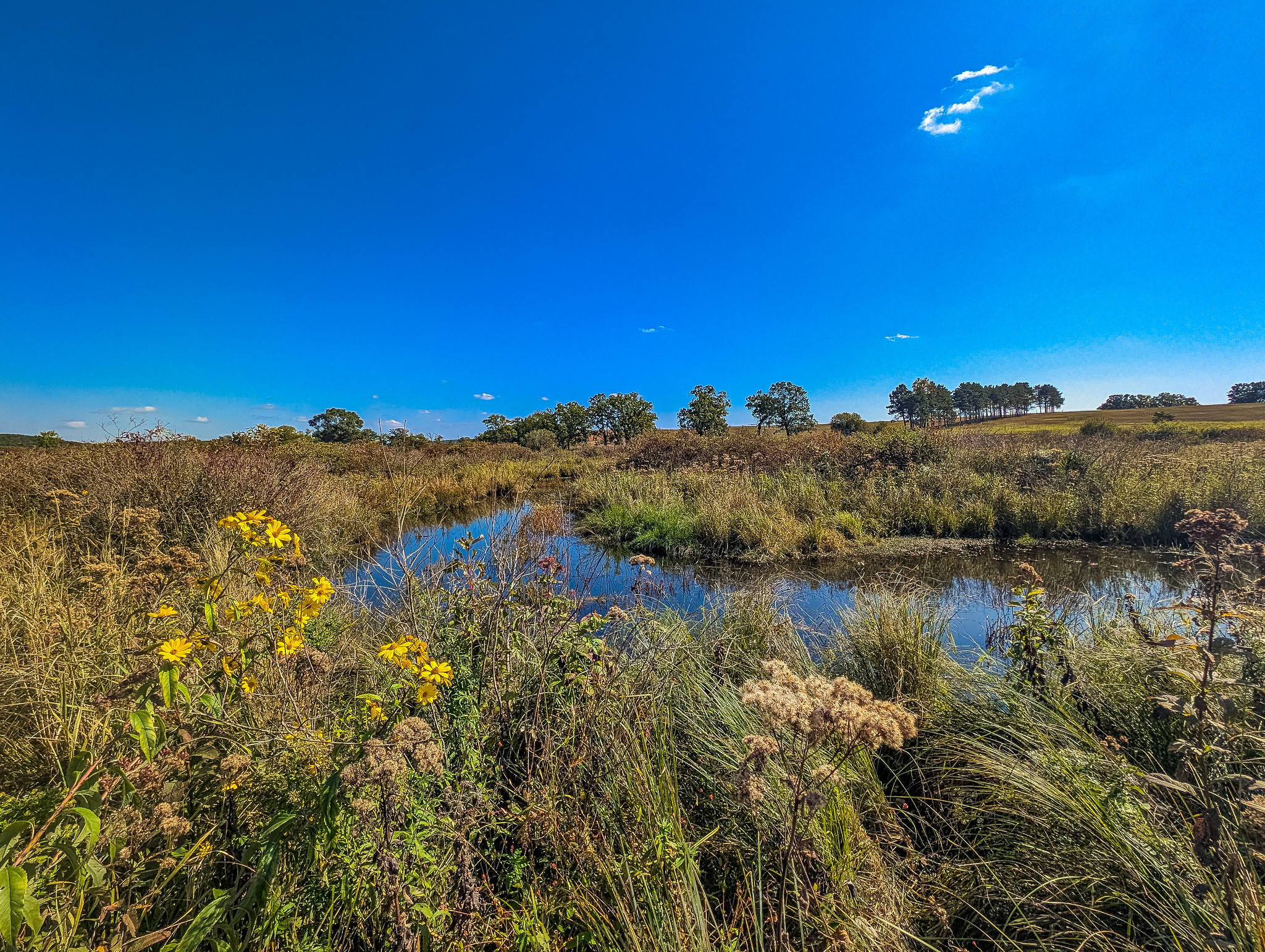 A return visit this past week brought me to the wondrous splendor that is a fen in fall. The petite bursts of color, particularly yellows and purples, set against the dulcet tones of the browning landscape paint a picture no words can do justice to. I parked near the intersection of 13th and 14th Rds and followed the path until I could see the based of the hill to the south. Up and over and through the fields of big and little bluestem and Indiangrass provided fantastic views of the fen and creek below. Back over my shoulder, I could see the tamarack swamp to the north, beckoning me for another visit. The fen was fen-tastic. Gentians were abundant and New England Asters punctuated the atmosphere. I would venture to say that the 3-4 weeks earlier would have been quite the floral show as well. I meandered along the creek and through the fen for a while, limited only by my needed departure time for a field trip. We shall meet again, French Creek North!