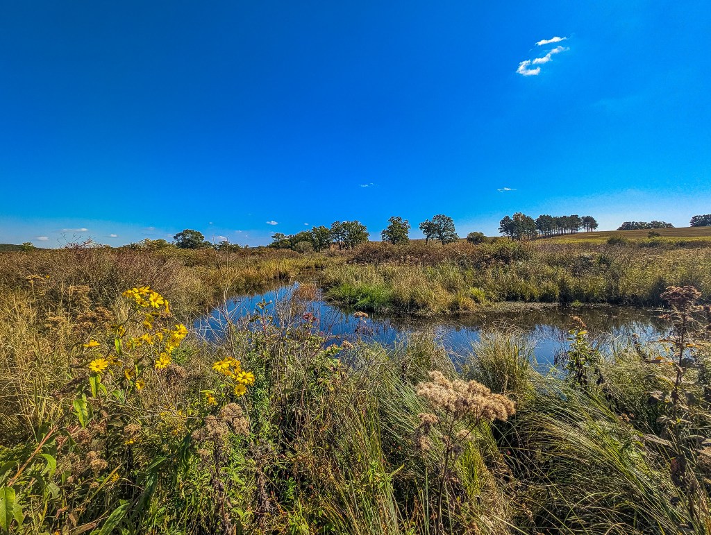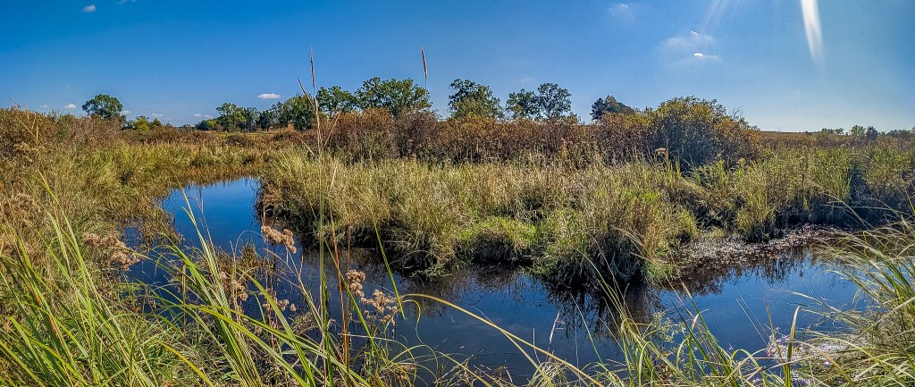 A return visit this past week brought me to the wondrous splendor that is a fen in fall. The petite bursts of color, particularly yellows and purples, set against the dulcet tones of the browning landscape paint a picture no words can do justice to. I parked near the intersection of 13th and 14th Rds and followed the path until I could see the based of the hill to the south. Up and over and through the fields of big and little bluestem and Indiangrass provided fantastic views of the fen and creek below. Back over my shoulder, I could see the tamarack swamp to the north, beckoning me for another visit. The fen was fen-tastic. Gentians were abundant and New England Asters punctuated the atmosphere. I would venture to say that the 3-4 weeks earlier would have been quite the floral show as well. I meandered along the creek and through the fen for a while, limited only by my needed departure time for a field trip. We shall meet again, French Creek North!