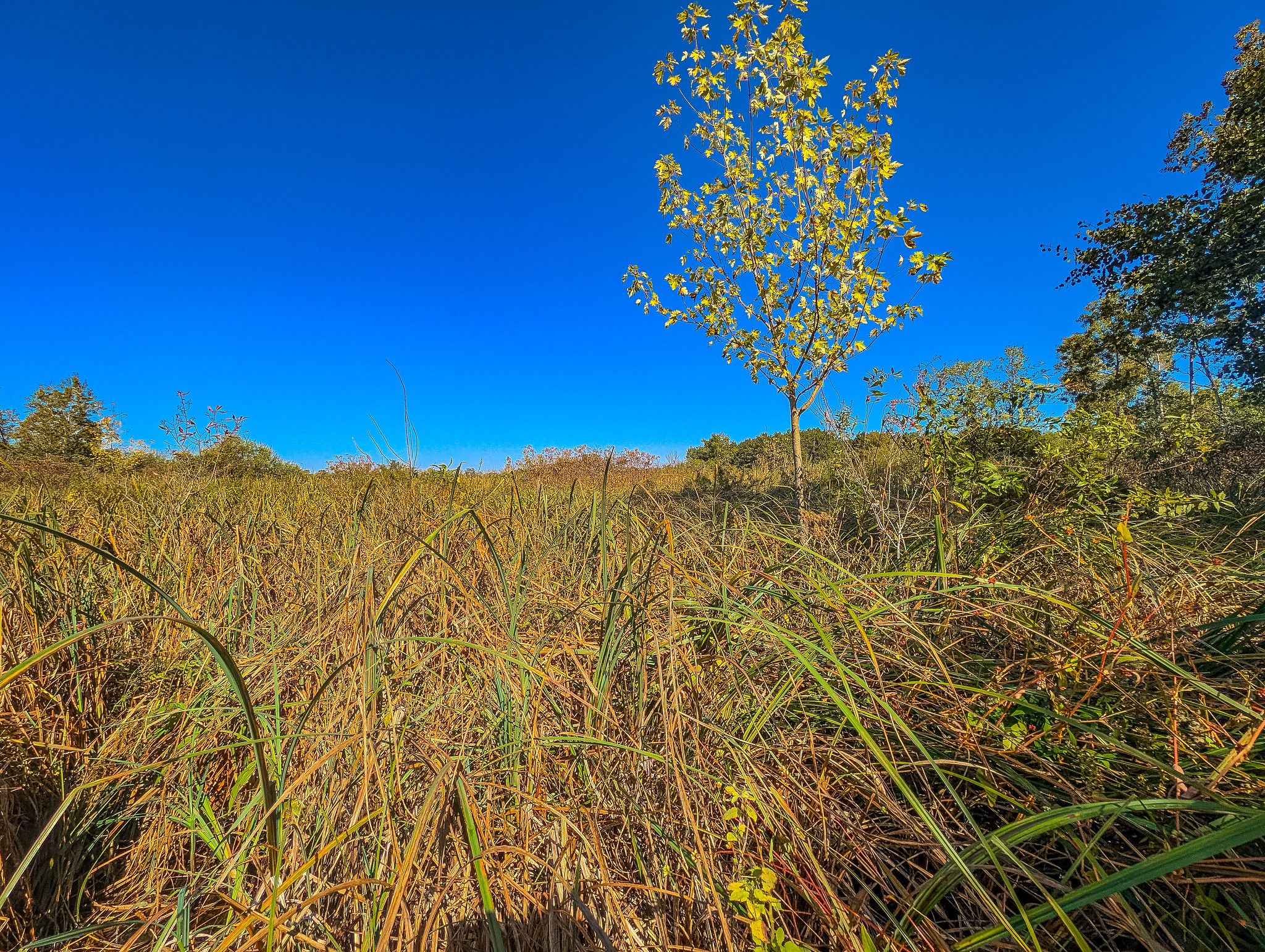 Wooded “islands” provided brief resting spots as I meandered through the relatively small site (approximately 50 acres; nearly 600th in size). Many areas were dominated by cattails towering over my somewhat tall frame. While incongruent with wide open panoramic photography, these microenvironments lend a feeling of true embeddedness within nature….truly making me feel small within the large natural community.